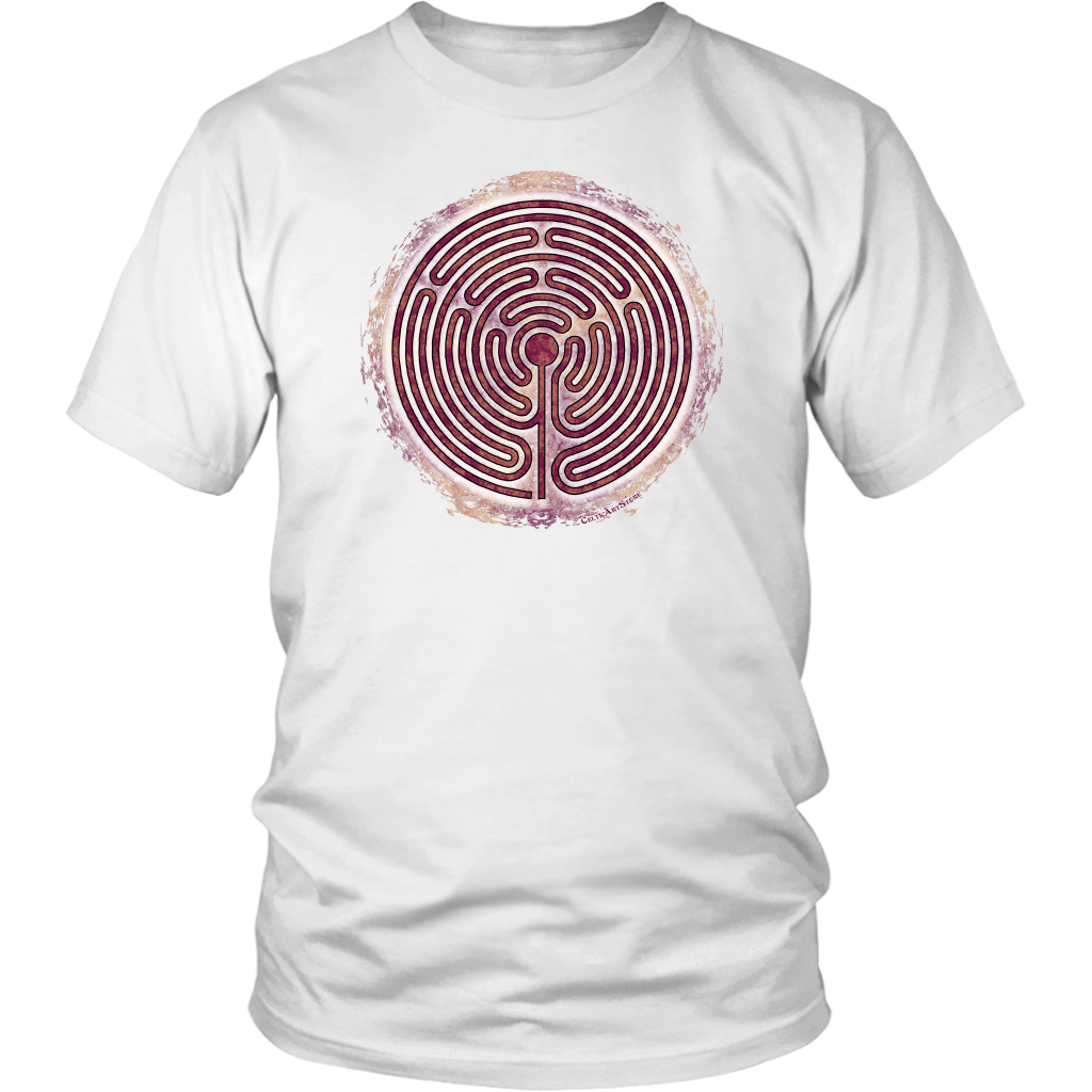 This shirt features the 10-Circuit Walking Labyrinth digital collage by Ravensdaughter Designs. 100% cotton, soft and comfortable.