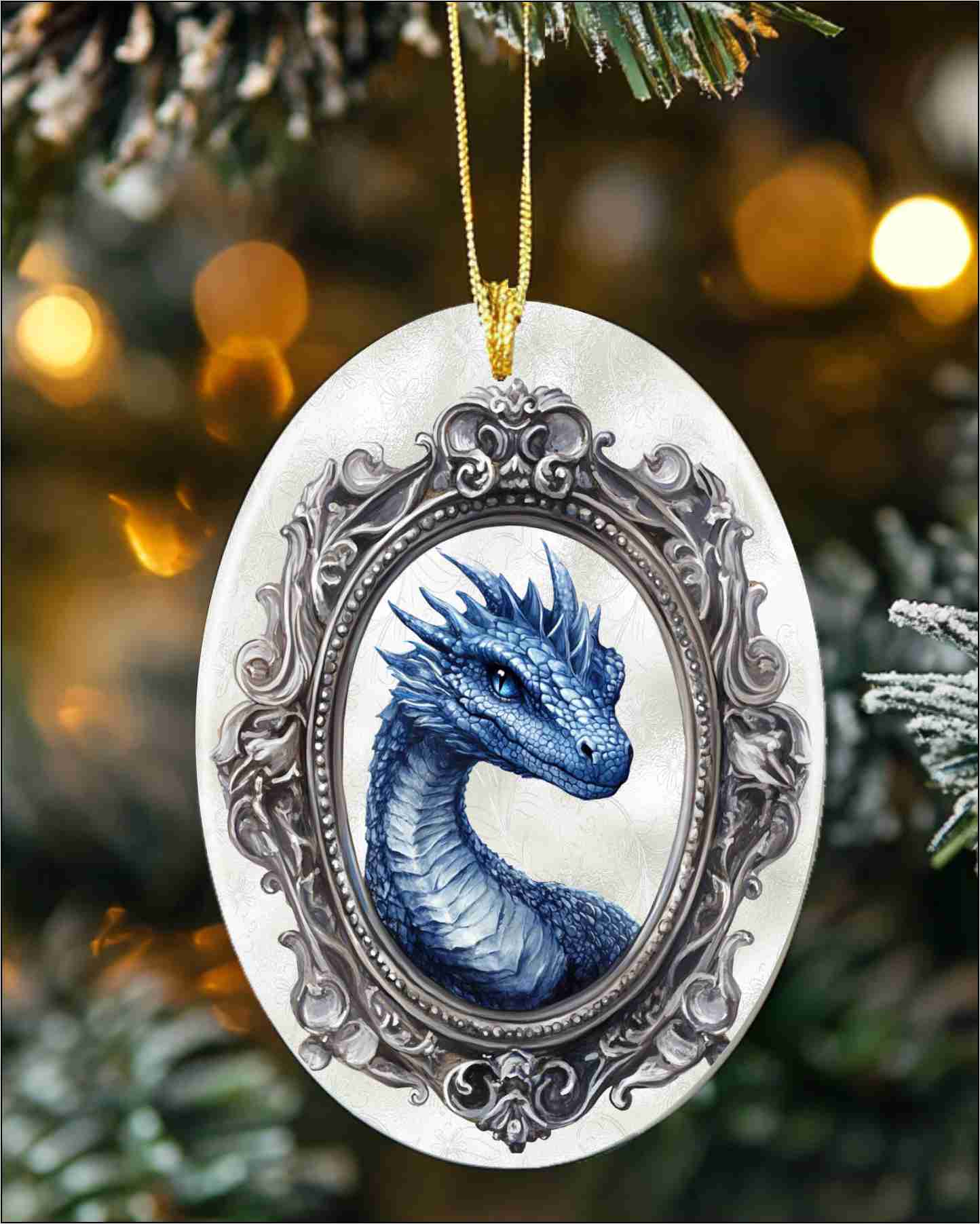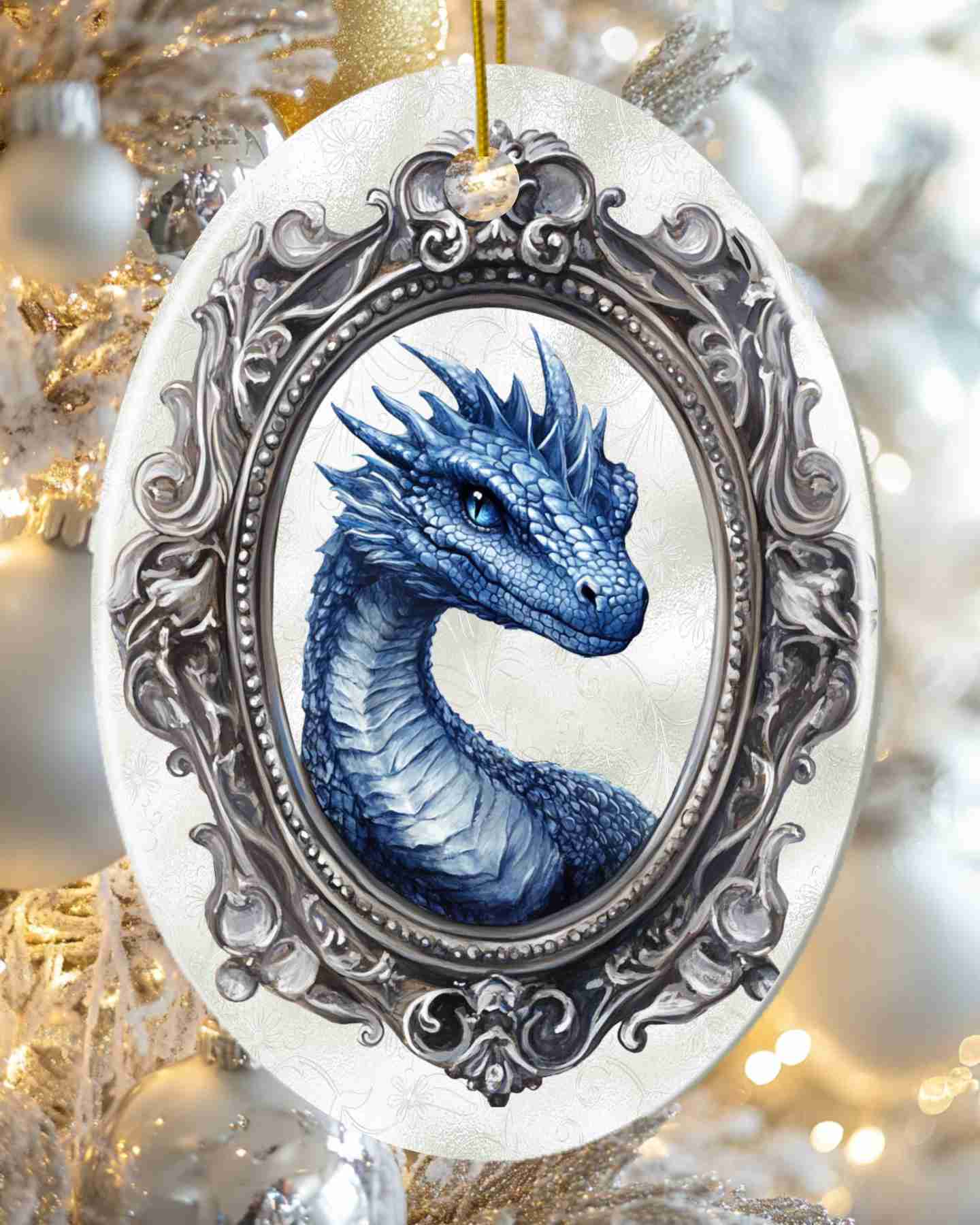 This ceramic hanging ornament features the Blue Dragon digital collage by Ravensdaughter. Lightweight with a gold cord. Hang it anywhere for a touch of fantasy flair!