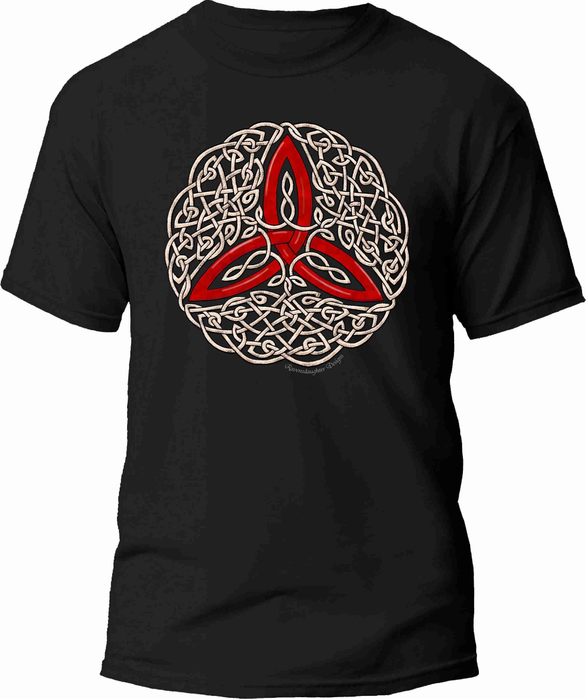 This comfy mid-weight cotton t-shirt features the Flourish Celtic Trinity Knot design by Ravensdaughter.