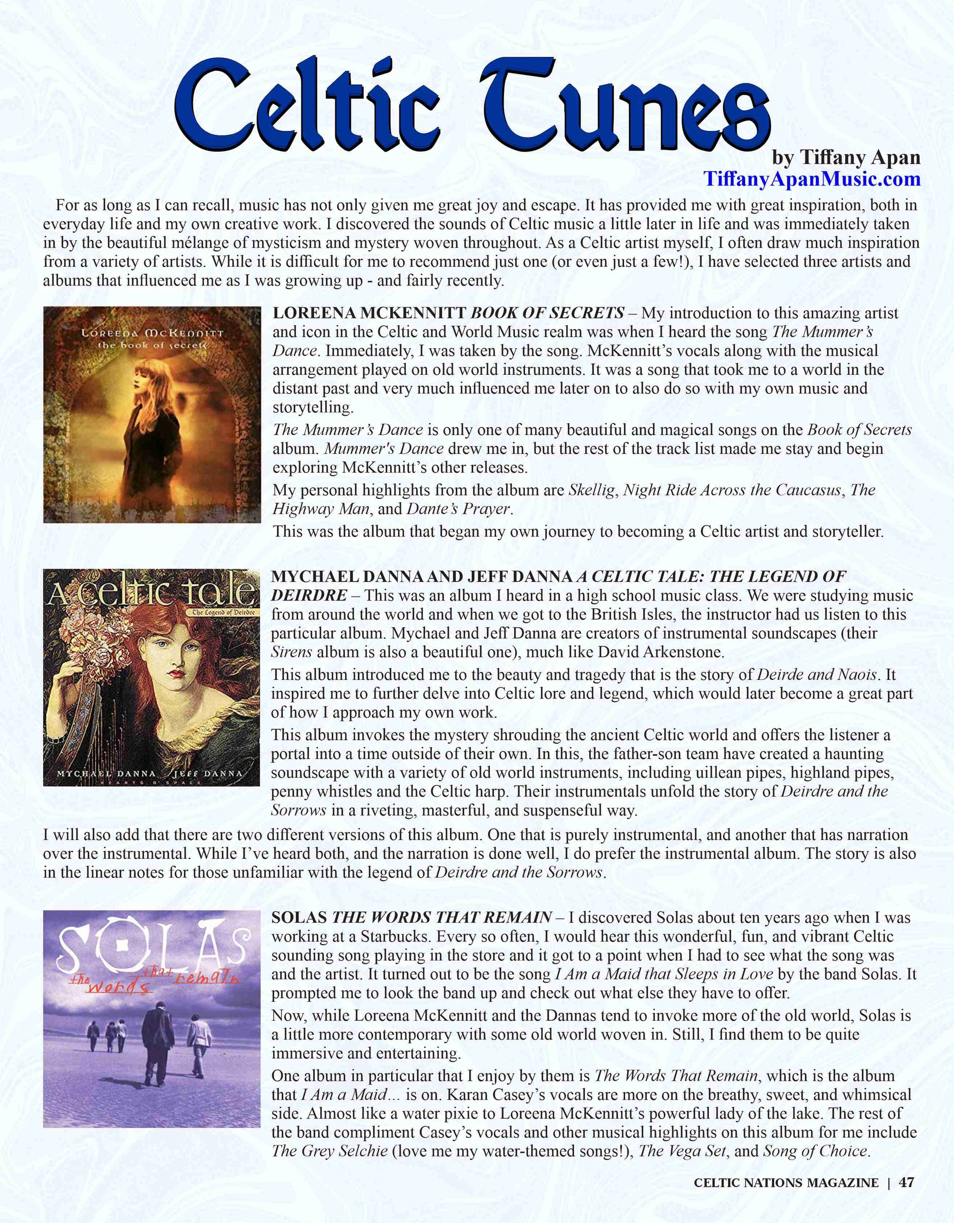 Celtic Nations Magazine is a NEW quarterly publication that explores the world's Celtic Nations. Each issue features an eclectic mix of Celtic history, modernity, art, music, mysticism, poetry, fiction, reviews and more.