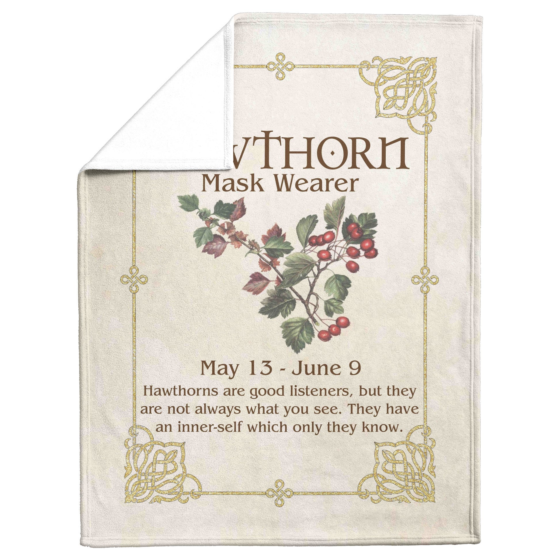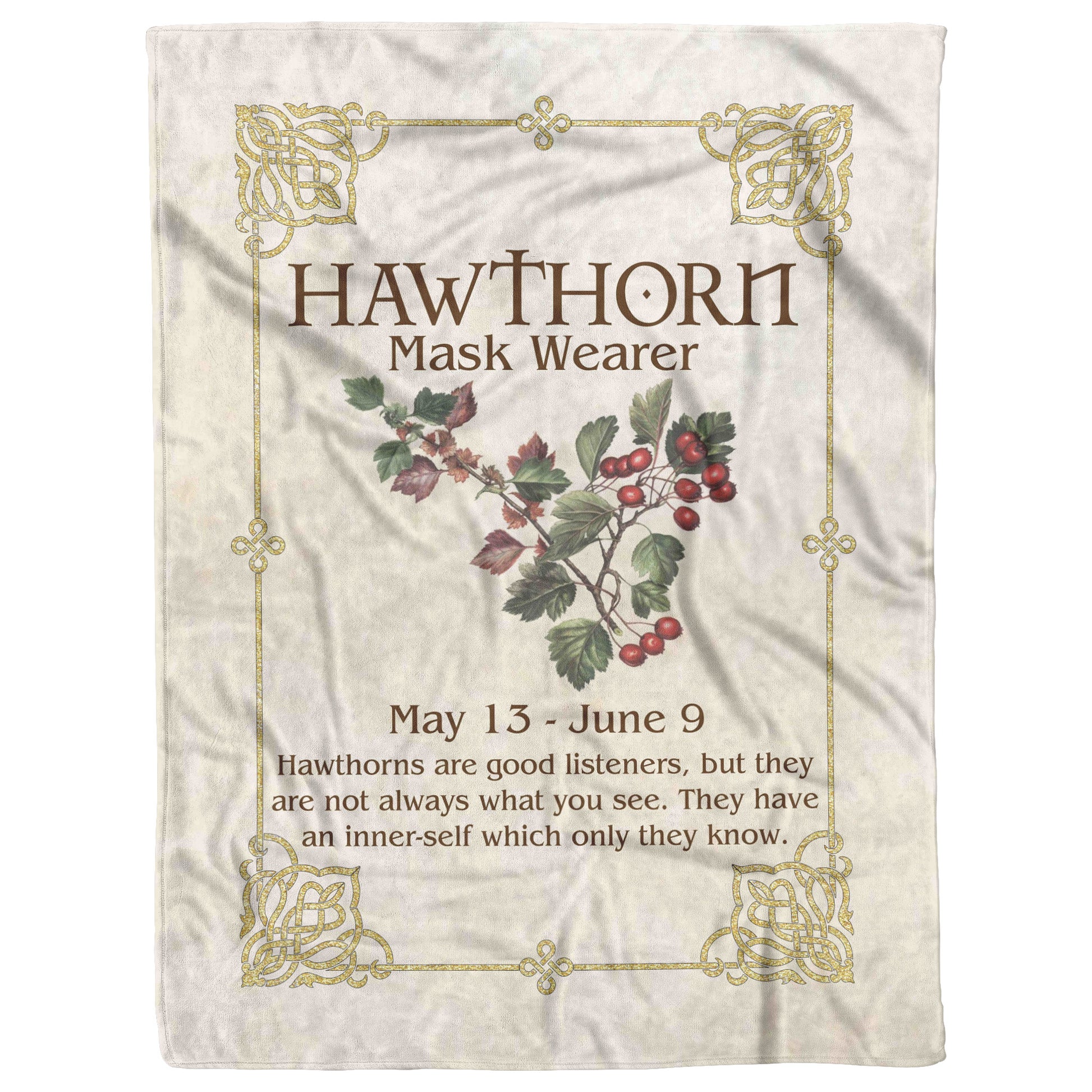 This lovely fleece blanket features the Celtic Tree Zodiac HAWTHORN, The Mask Wearer. Hawthorns are good listeners, but they are not always what you see. They have an inner-self which only they know.