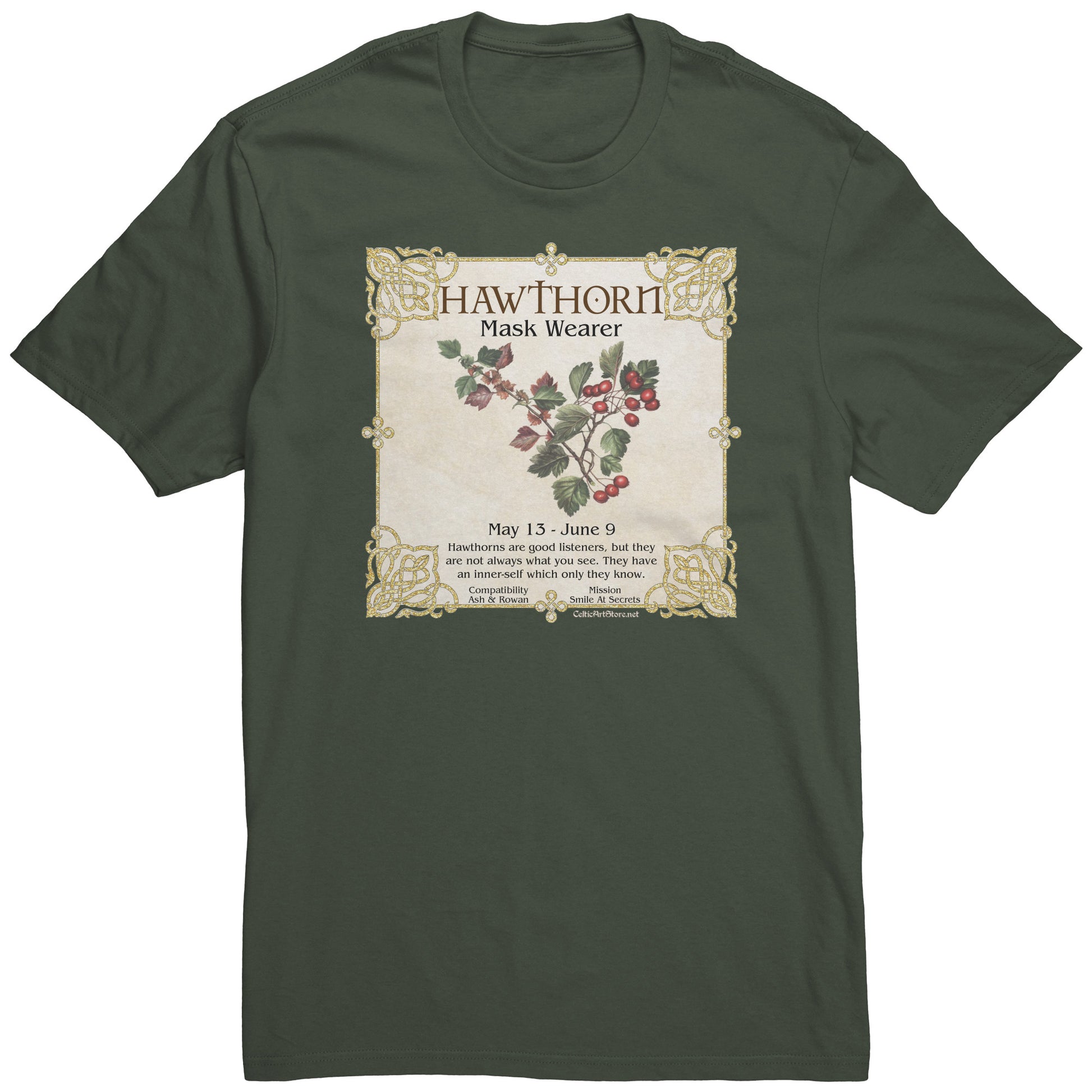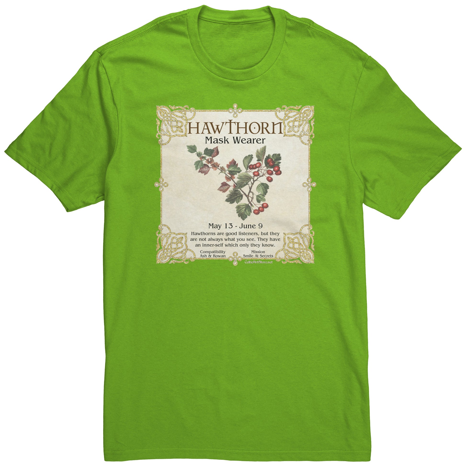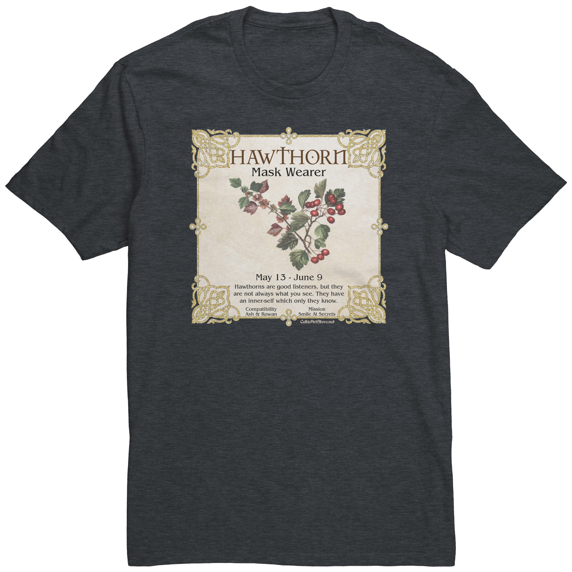 These soft, mid-weight cotton tees feature the Celtic Tree Zodiac HAWTHORN, The Mask Wearer. Hawthorns are good listeners, but they are not always what you see. They have an inner-self which only they know.