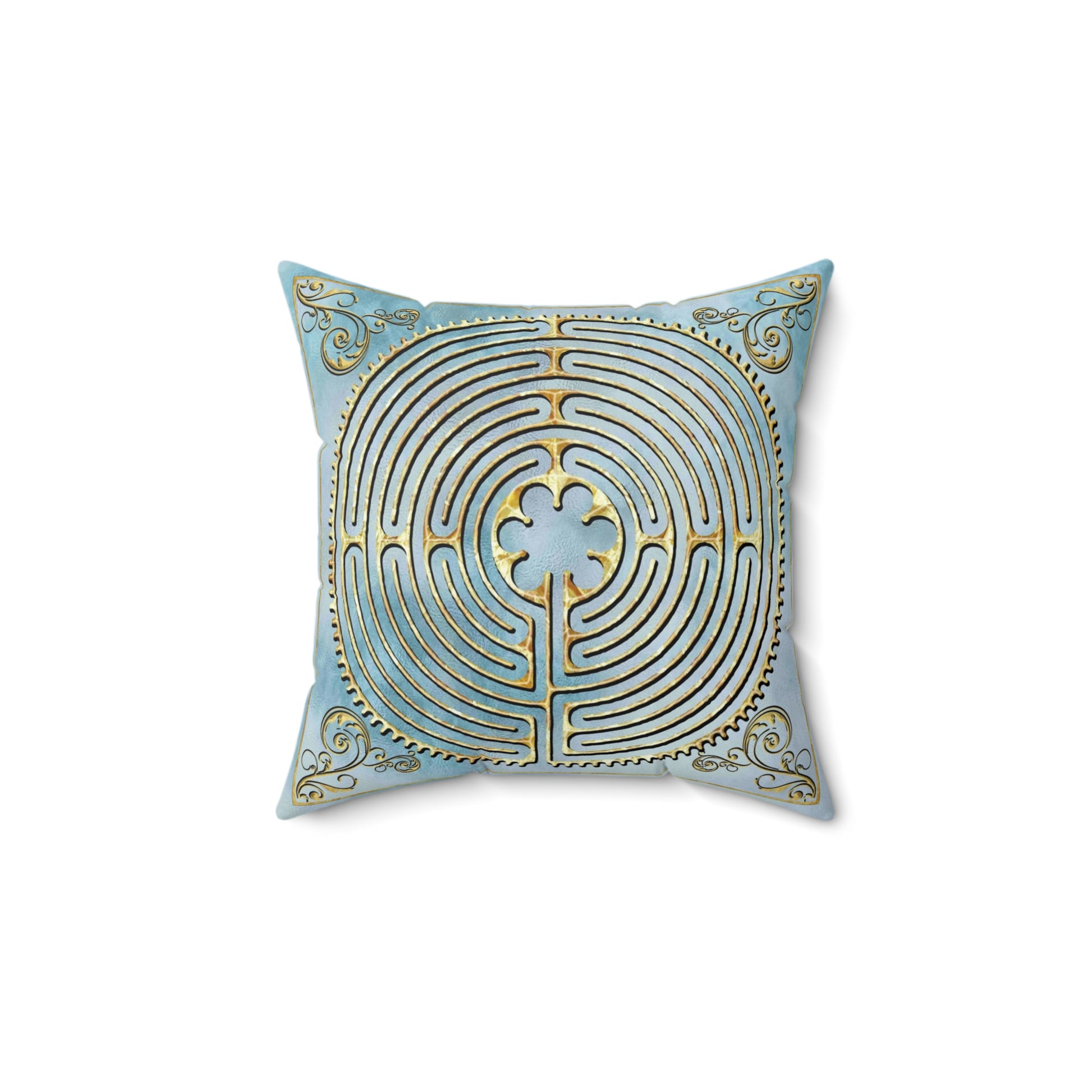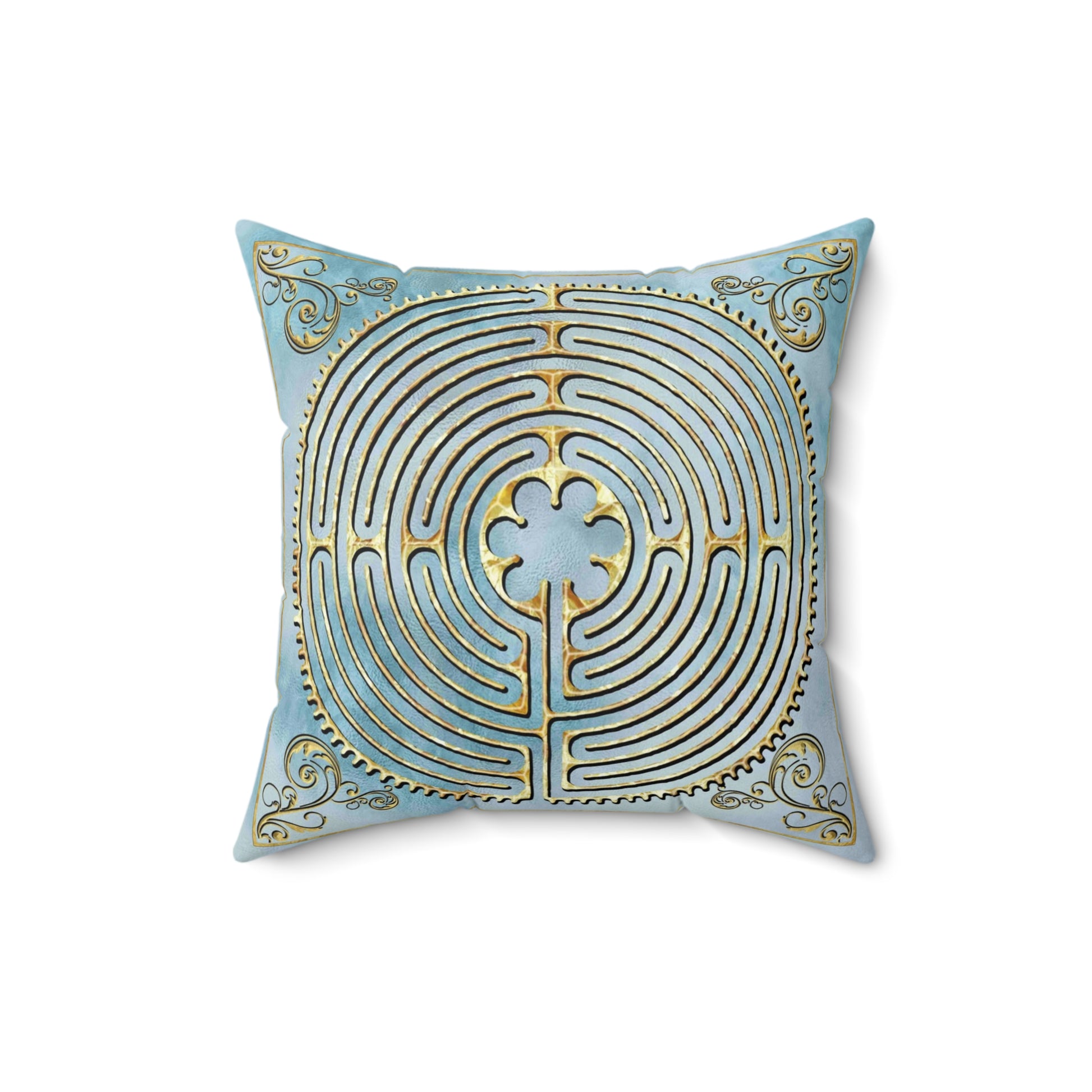This colorful throw pillow features the Chartres Cathedral Labyrinth digital collage by Ravensdaughter Designs. The image has a 3-D appearance even though it is printed directly on the fabric. The decorative scroll accents give the design a classic look.