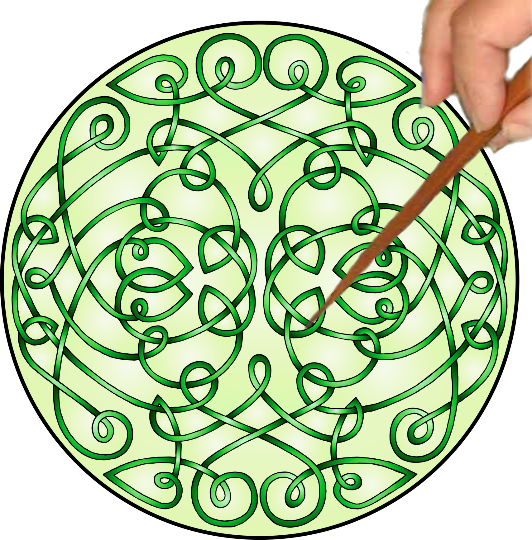 The Green Celtic Curls is an OPEN Mandalynth design that has gentle, curling feel when traced. The Celtic Curls Mandalynth is created from a single, unbroken line that weaves about the pattern. It has a “1-2-3 tempo”, similar to a waltz. Count this tempo aloud or silently to create a light self-hypnosis. The Celtic Curls Mandalynth is good for stress relief, anxiety relief, panic attack management, and trauma management.