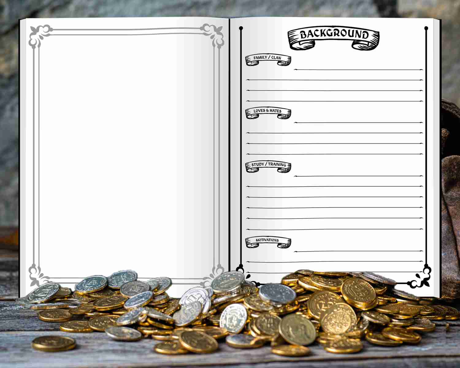 - A Background Sheet for Family/Clan History, Loves & Hates, Study & Training, and Motivations.