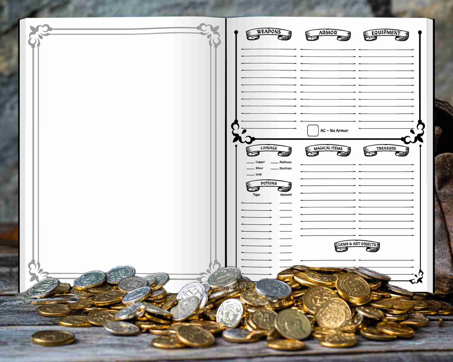 - An Inventory Sheet for Weapons, Armor, Equipment, Coinage, Magical Items, and Treasure.