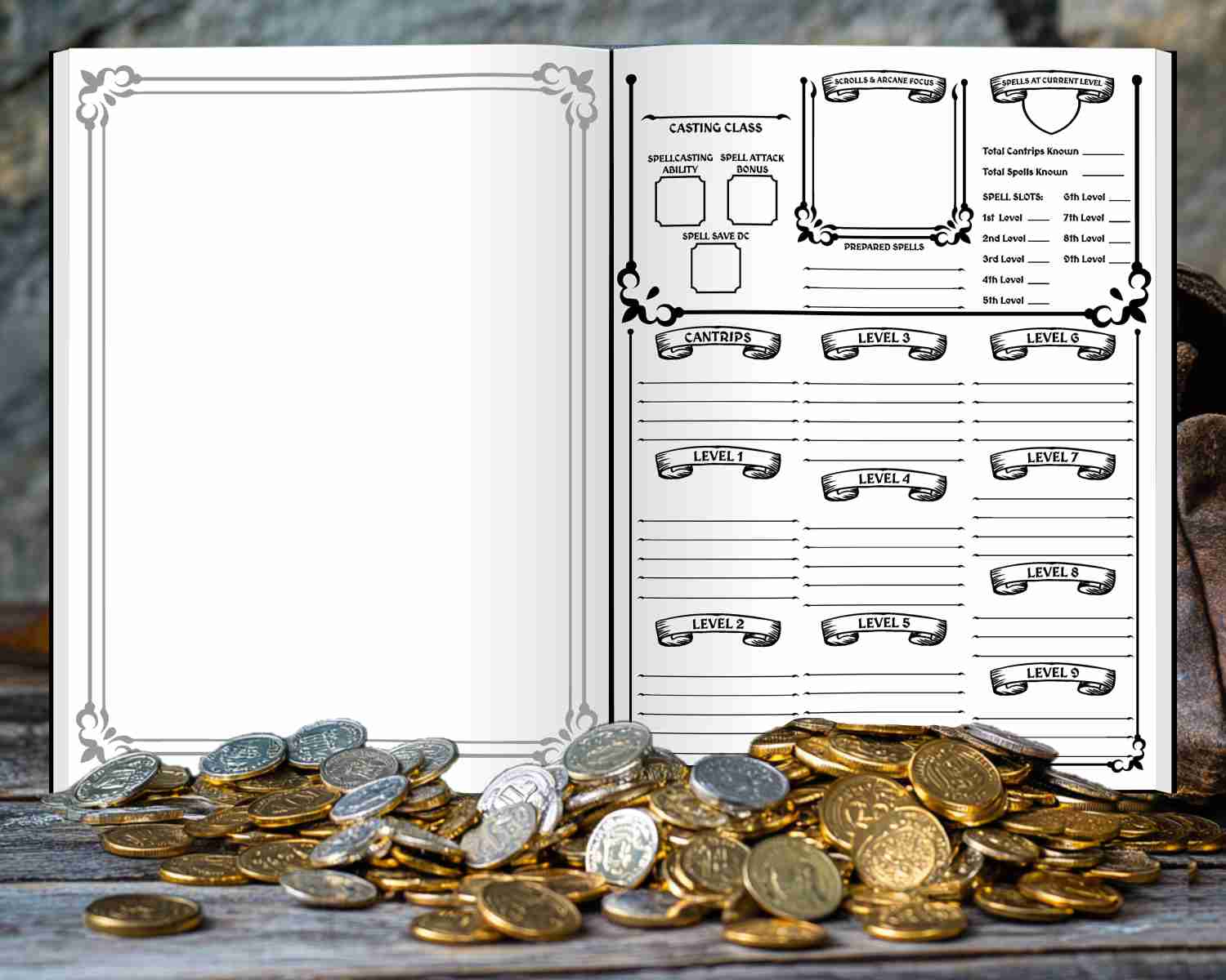 - A Spellcasting Sheet for Prepared Spells, Spell Slots, Cantrips, and Level Spells.