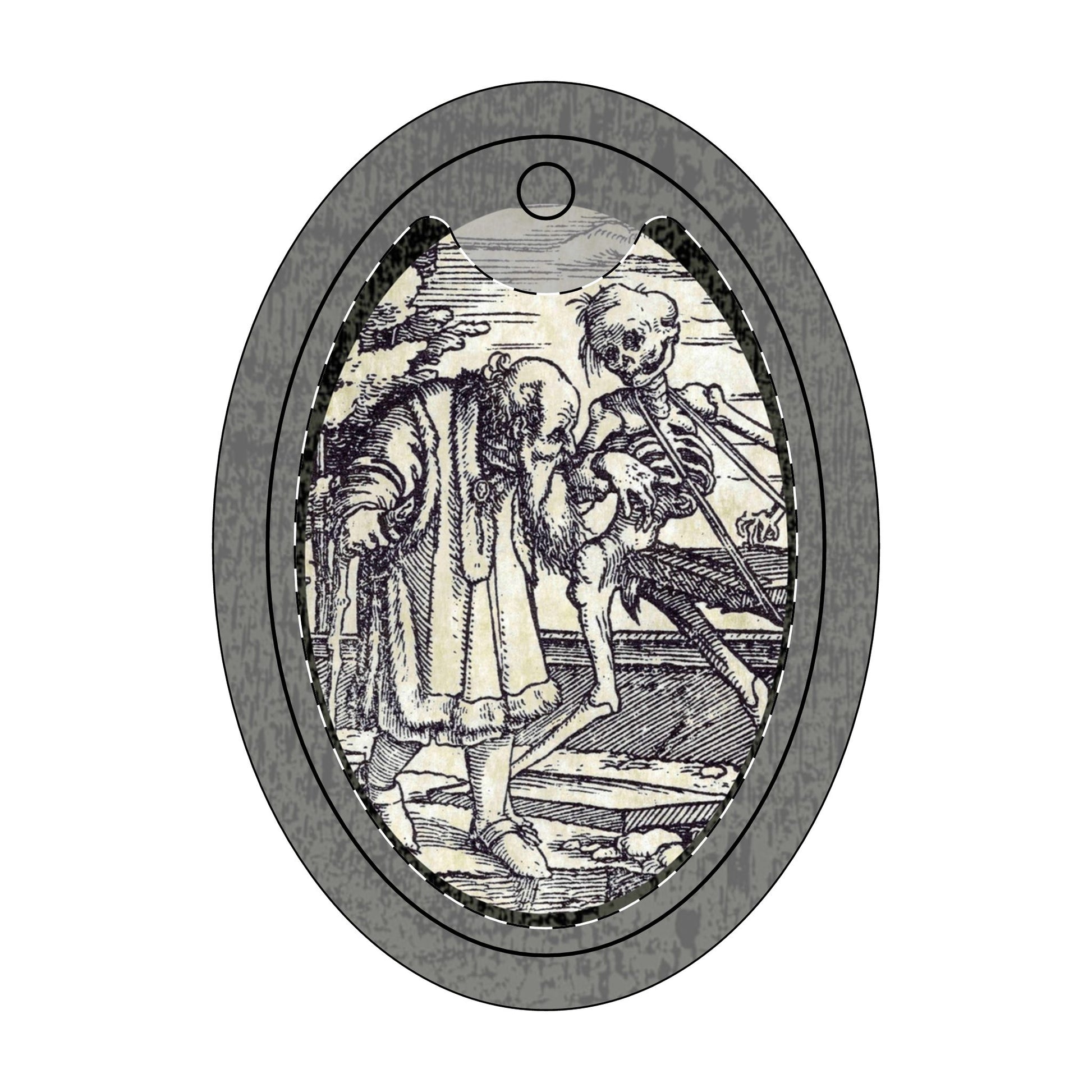 The Danse Macabre is an allegorical artistic genre from the Late Middle Ages focusing on the universality of death. This holiday ornament features The Old Man woodcut by Hans Holbein.