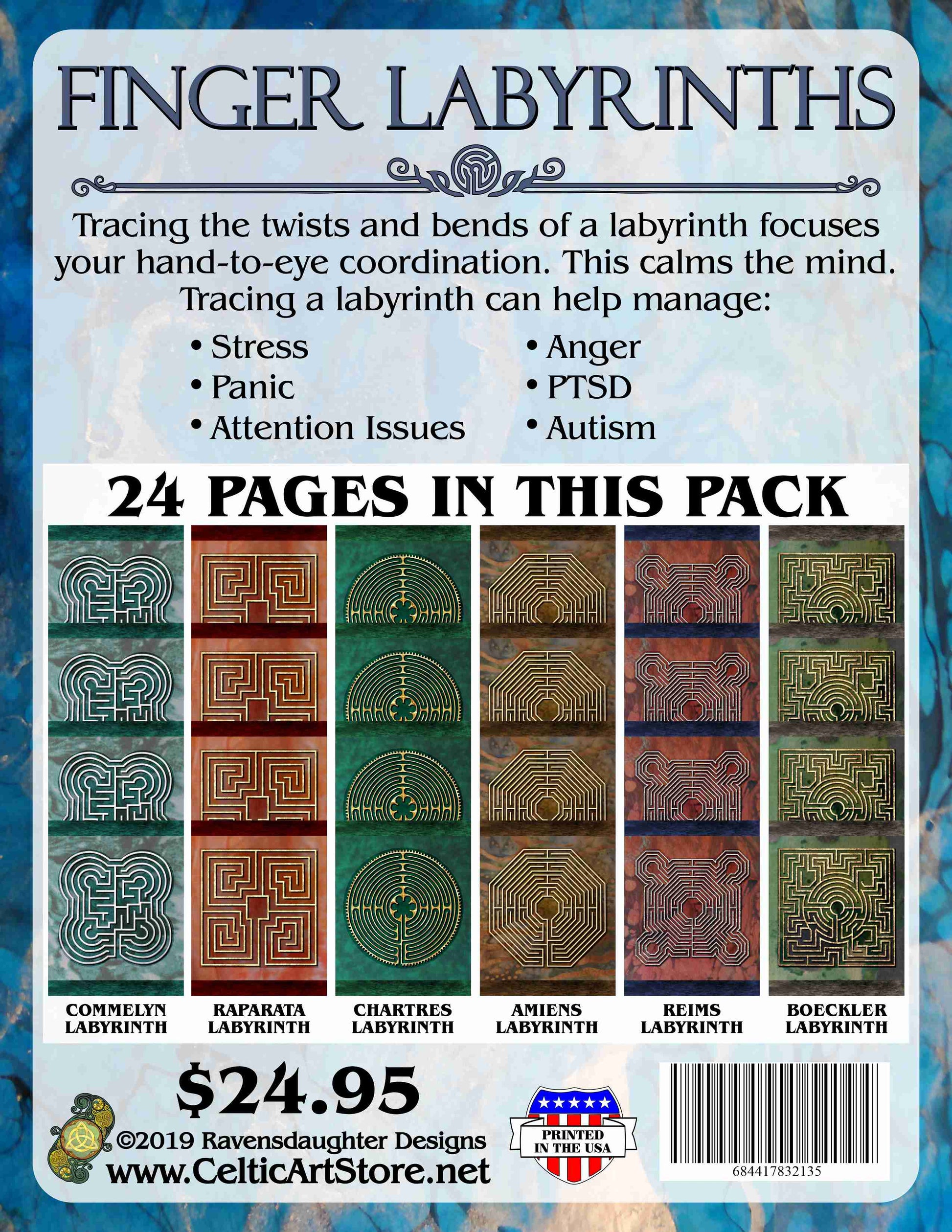 Each Finger Labyrinth is a digital art design by Ravensdaughter, the mindfulness artist who created the Celtic Mandalynth.