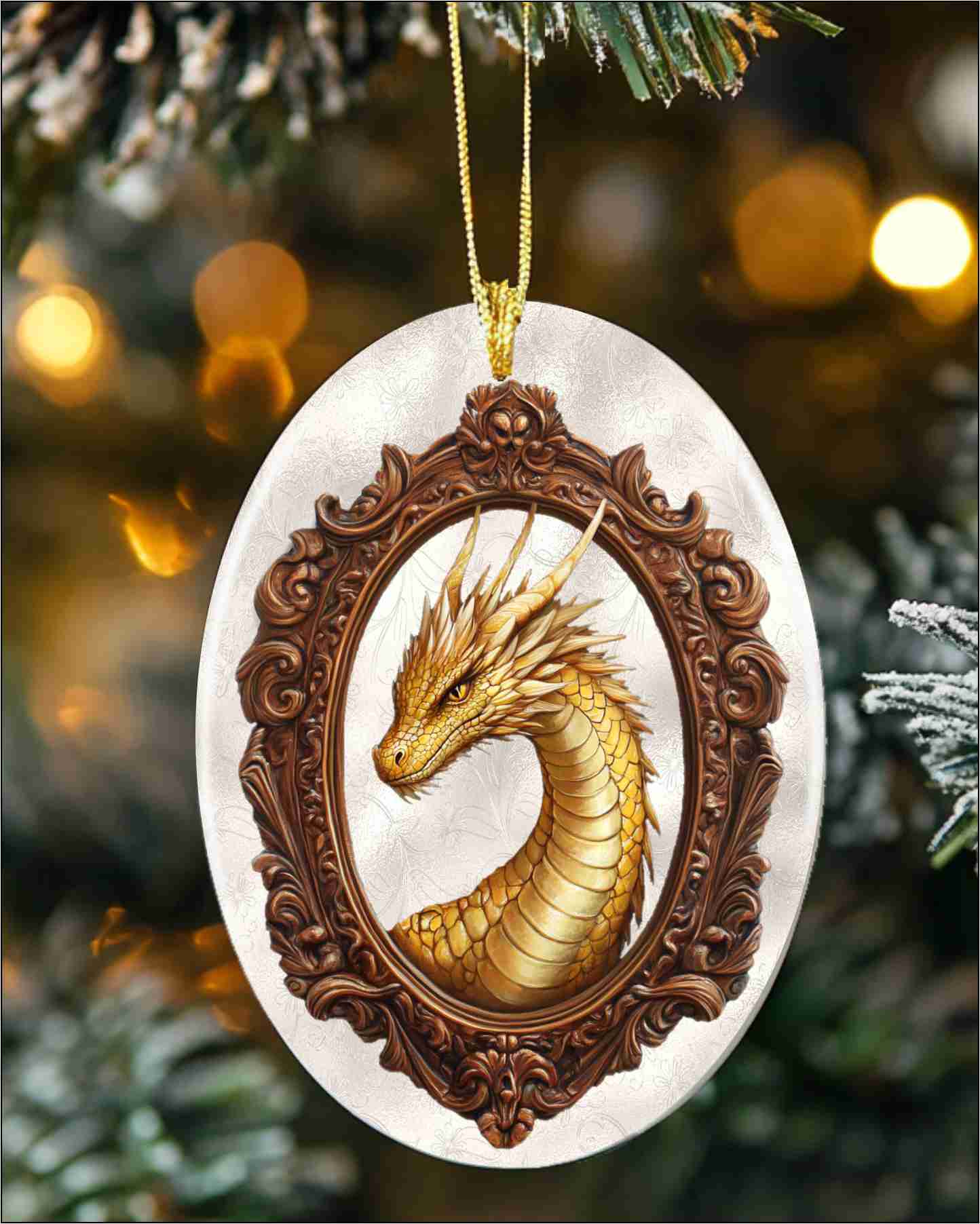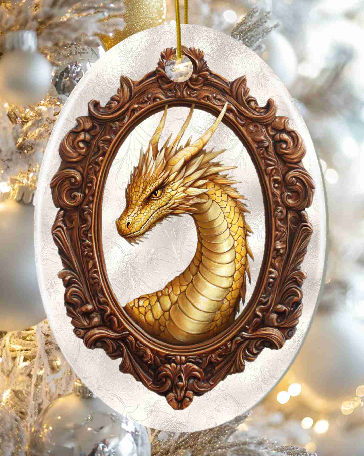 This ceramic hanging ornament features the Gold Dragon digital collage by Ravensdaughter. Lightweight with a gold cord. Hang it anywhere for a touch of fantasy flair!