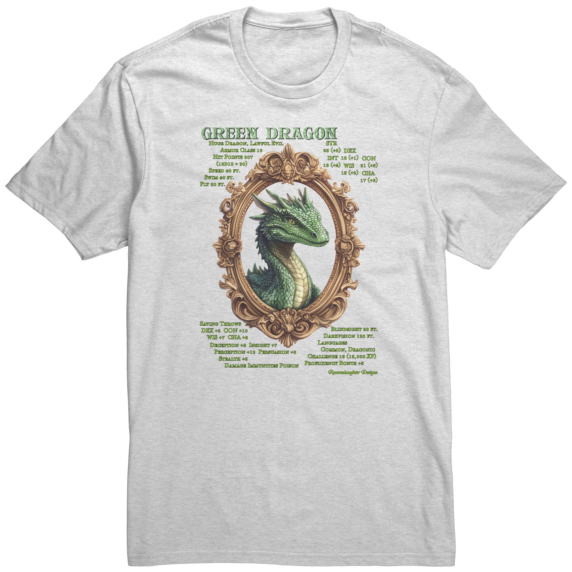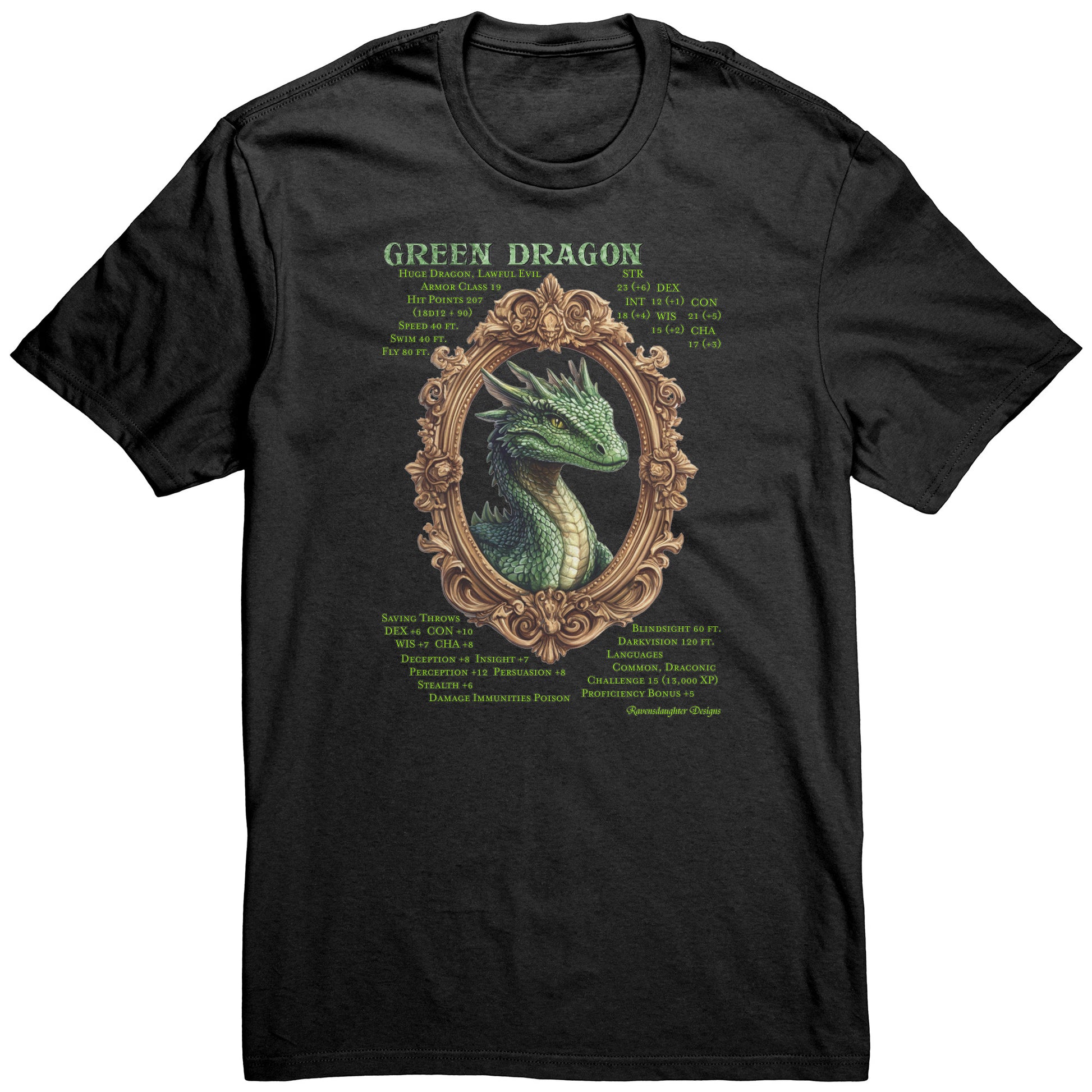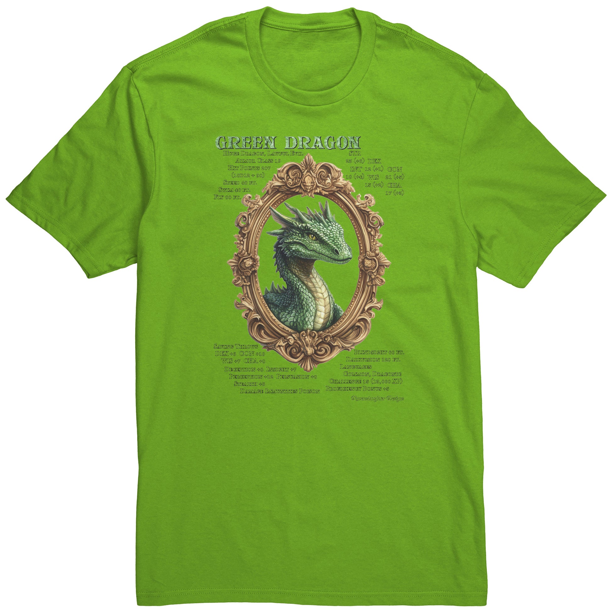 This comfy, mid-weight cotton t-shirt features the key attributes of the Lawful Evil Green Dragon. Beware!