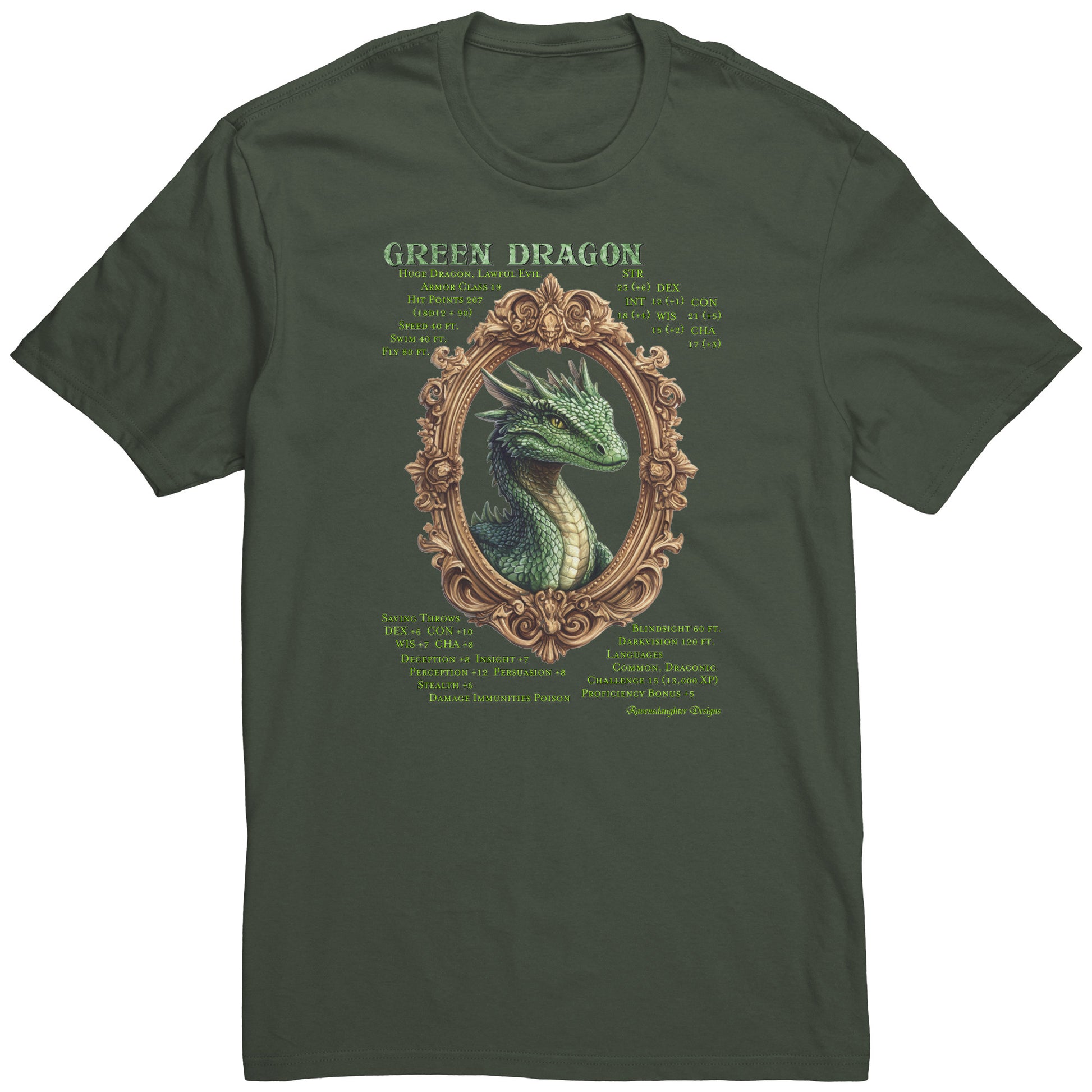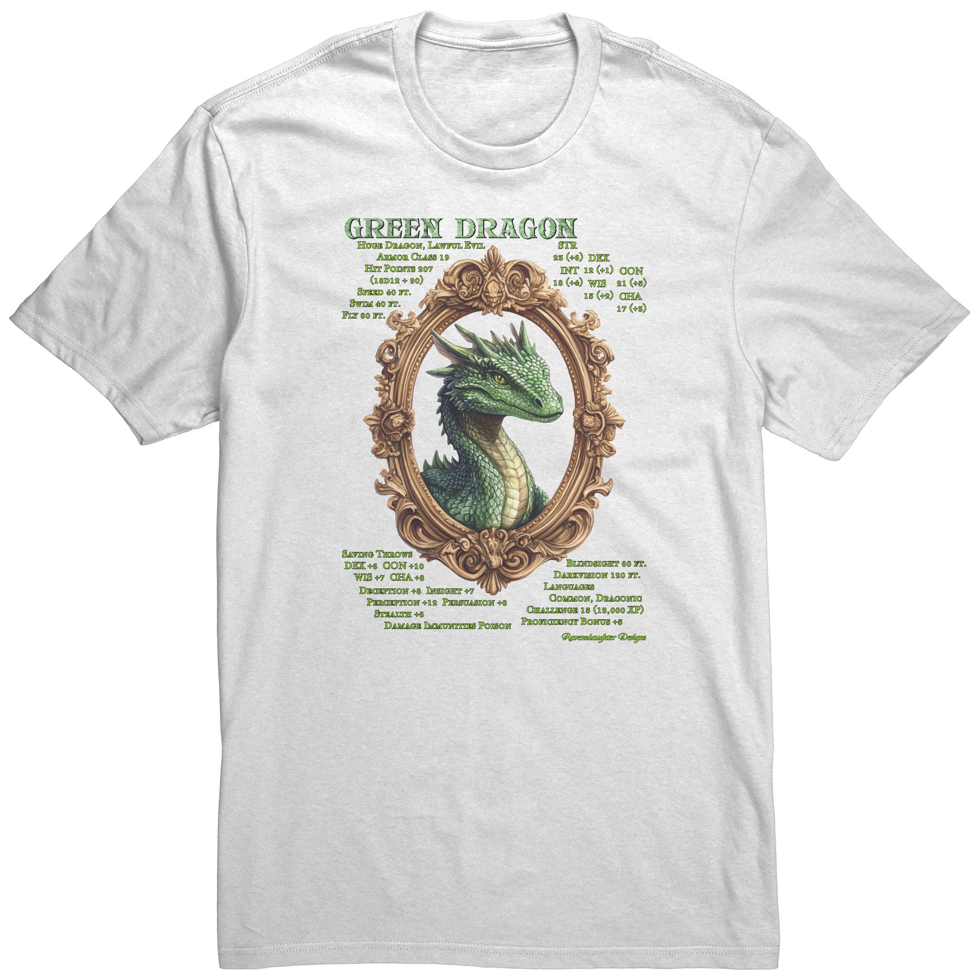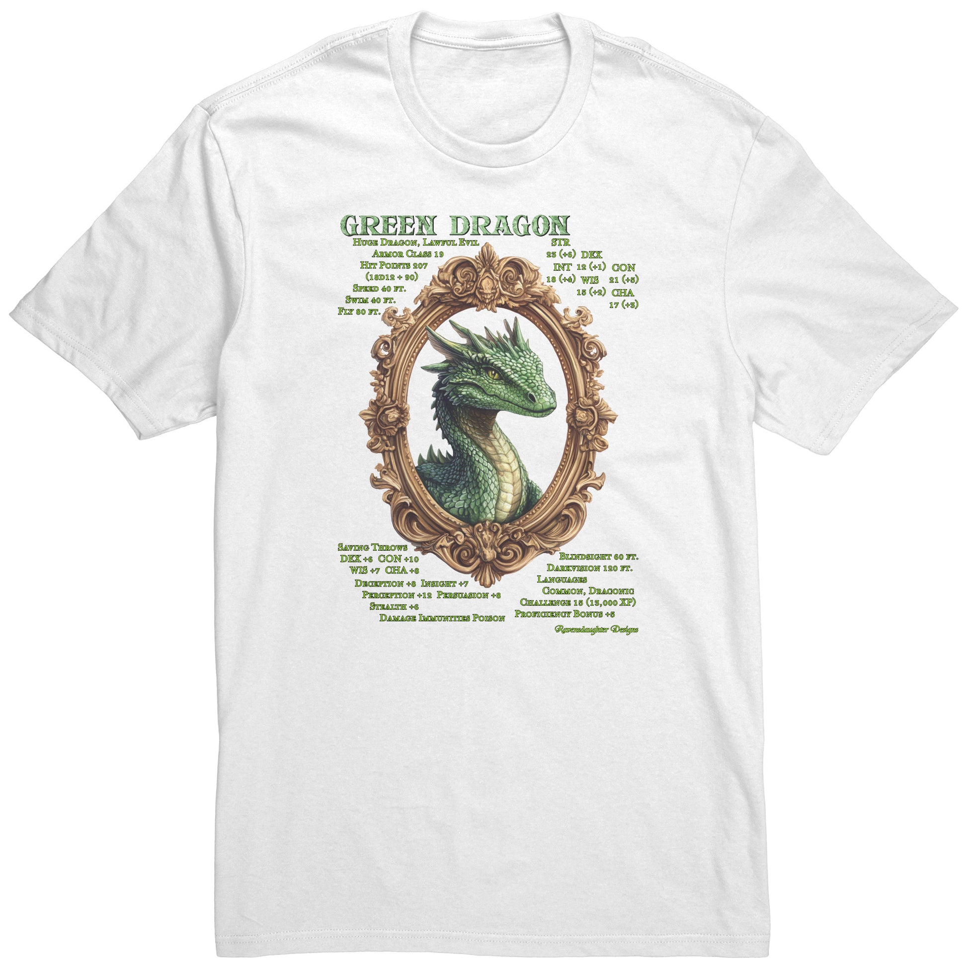 This comfy, mid-weight cotton t-shirt features the key attributes of the Lawful Evil Green Dragon. Beware!