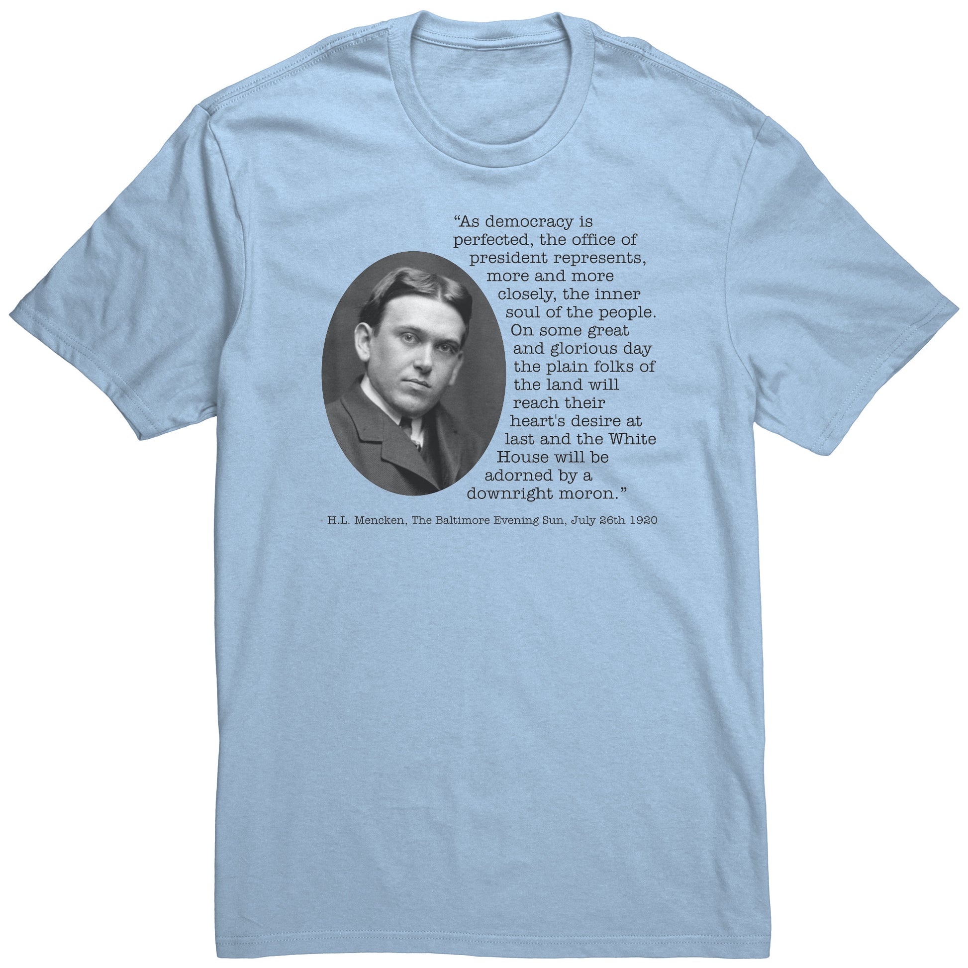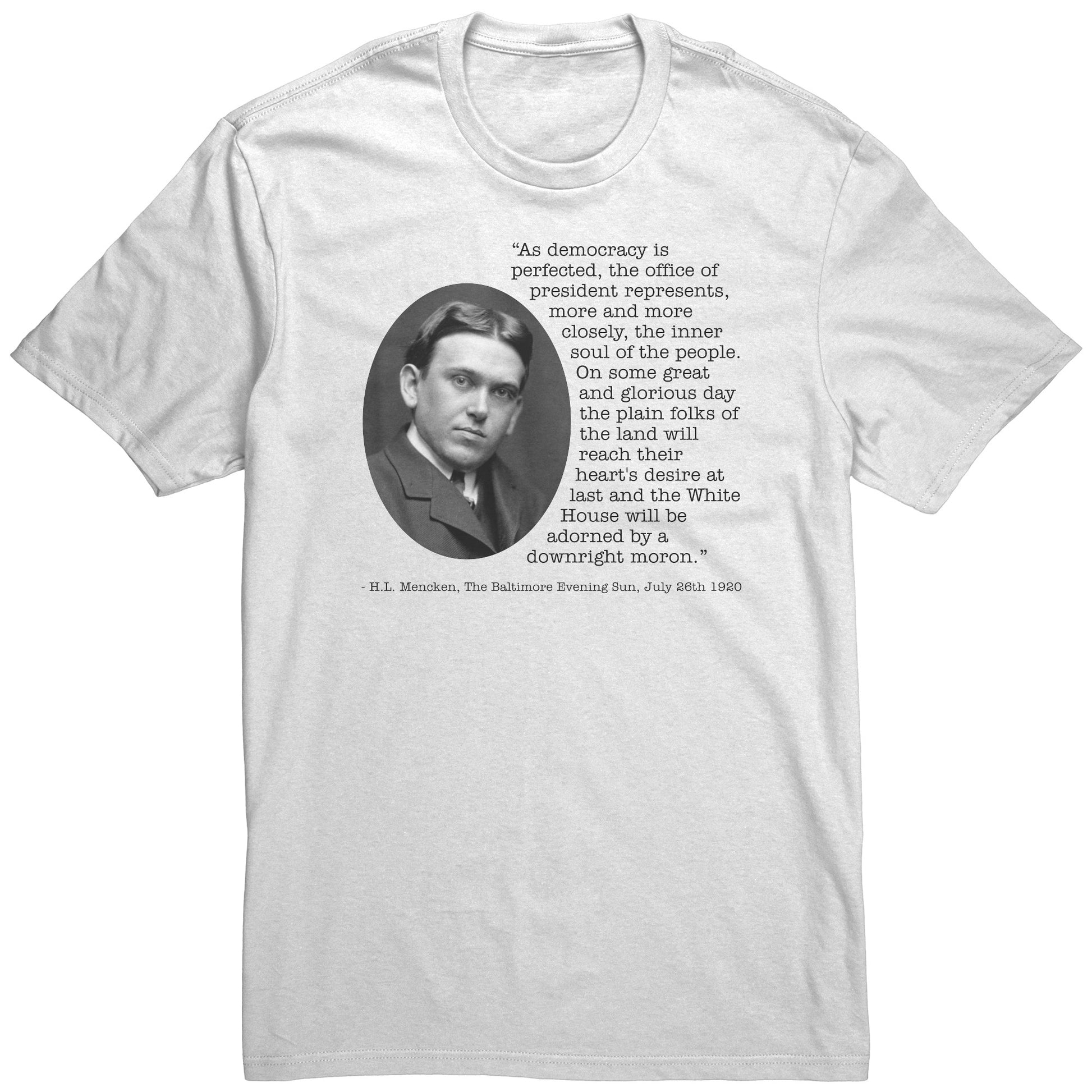 “As democracy is perfected, the office of president represents, more and more closely, the inner soul of the people. On some great and glorious day the plain folks of the land will reach their heart's desire at last and the White House will be adorned by a downright moron.” H.L. Mencken