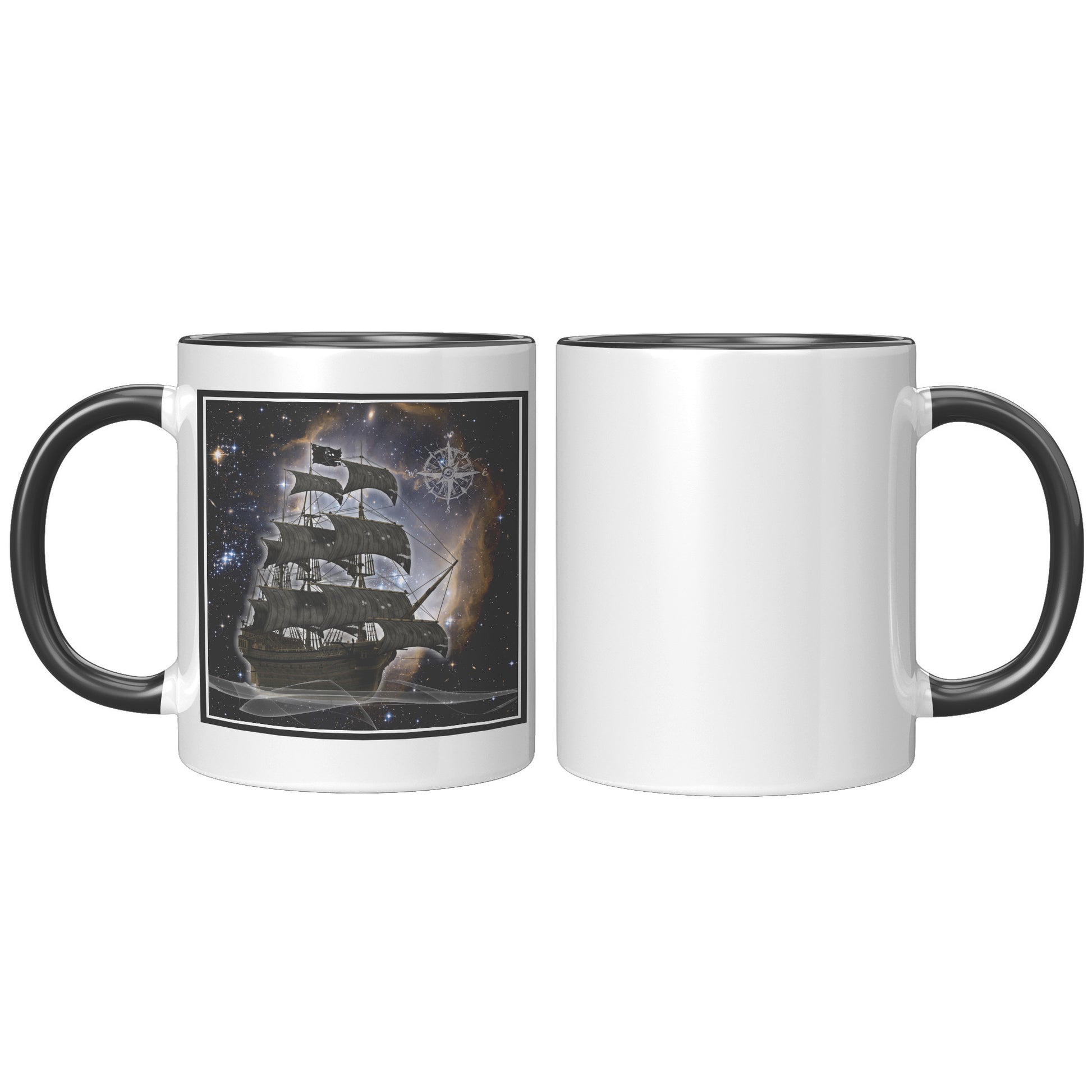 Sail away in these Cosmic Pirate Ghost Ship coffee mugs. Dishwasher and Microwave Safe. 3.7″H x 3.7″W x 3.2″D. Available with black or white accent colors.