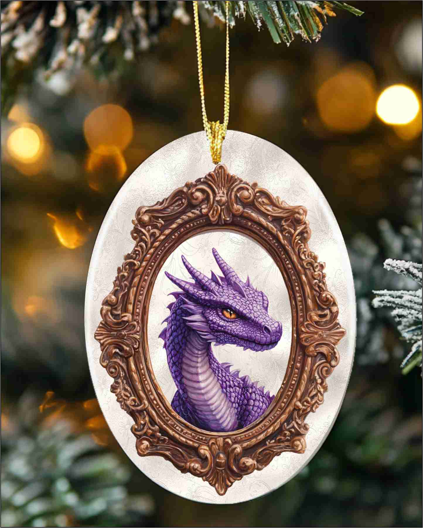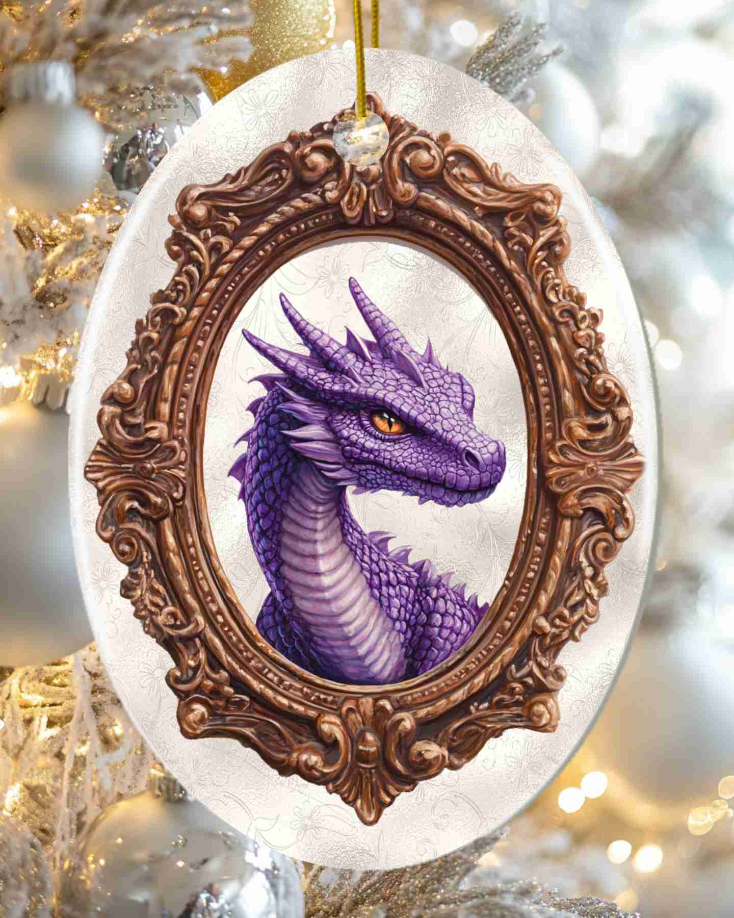 This ceramic hanging ornament features the Purple Dragon digital collage by Ravensdaughter. Lightweight with a gold cord. Hang it anywhere for a touch of fantasy flair!
