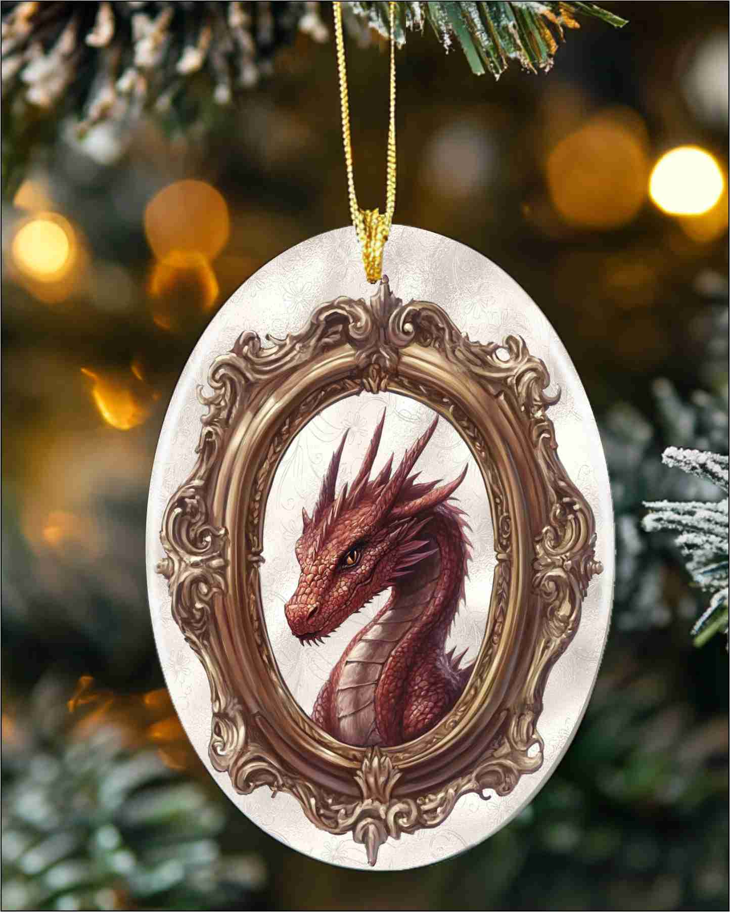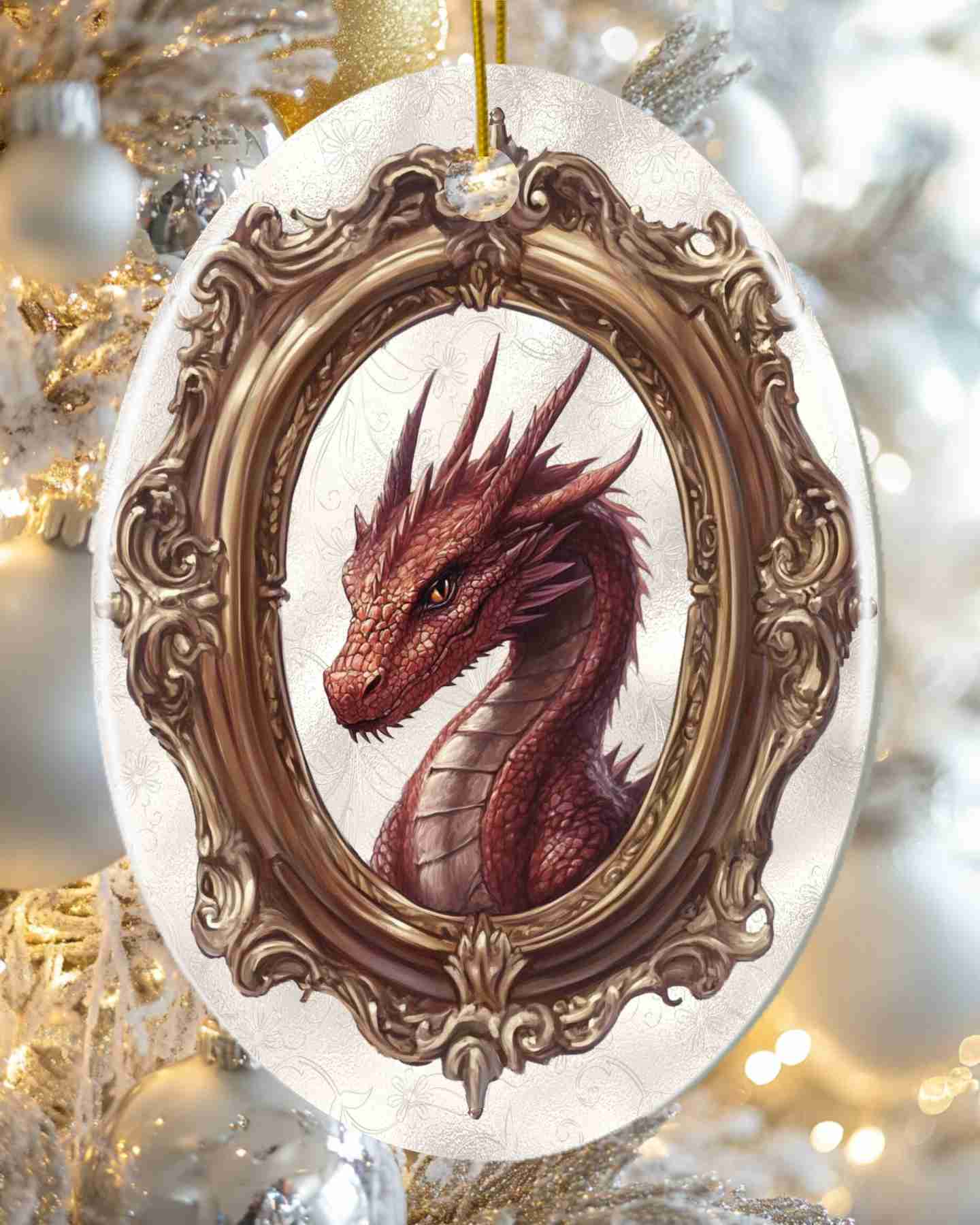 This ceramic hanging ornament features the Red Dragon digital collage by Ravensdaughter. Lightweight with a gold cord. Hang it anywhere for a touch of fantasy flair!