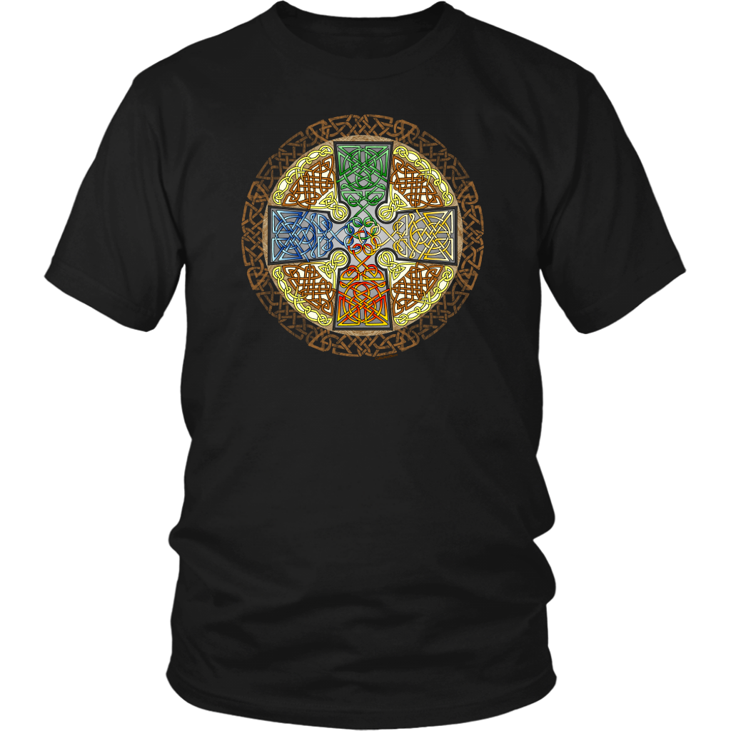 A new "twist" on classic Celtic Art Knotwork. The base design for this original Celtic Cross tee by Ravensdaughter Designs is created from one single, unbroken line that forms both the Cross and the Knotted Ring joining the four arms. Each arm is colored for the elements; earth, air, fire and water.