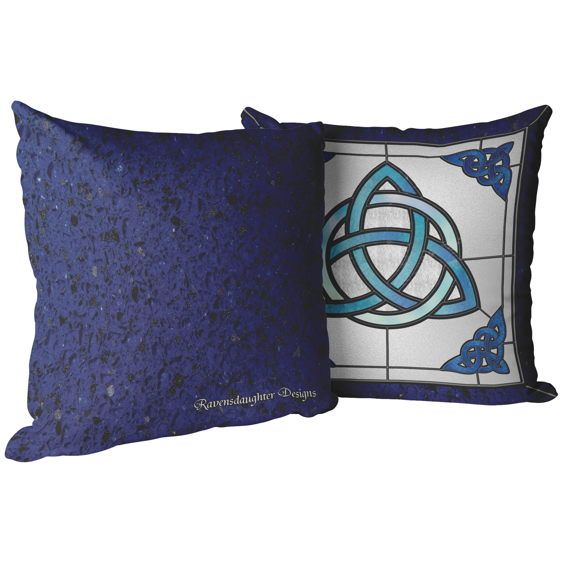 This lovely throw pillow features the Blue Stained Glass Celtic Triquetra design by Ravensdaughter. These poly-broadcloth pillows are soft and durable, which means they are a fully functional pieces of art that are meant to be used.