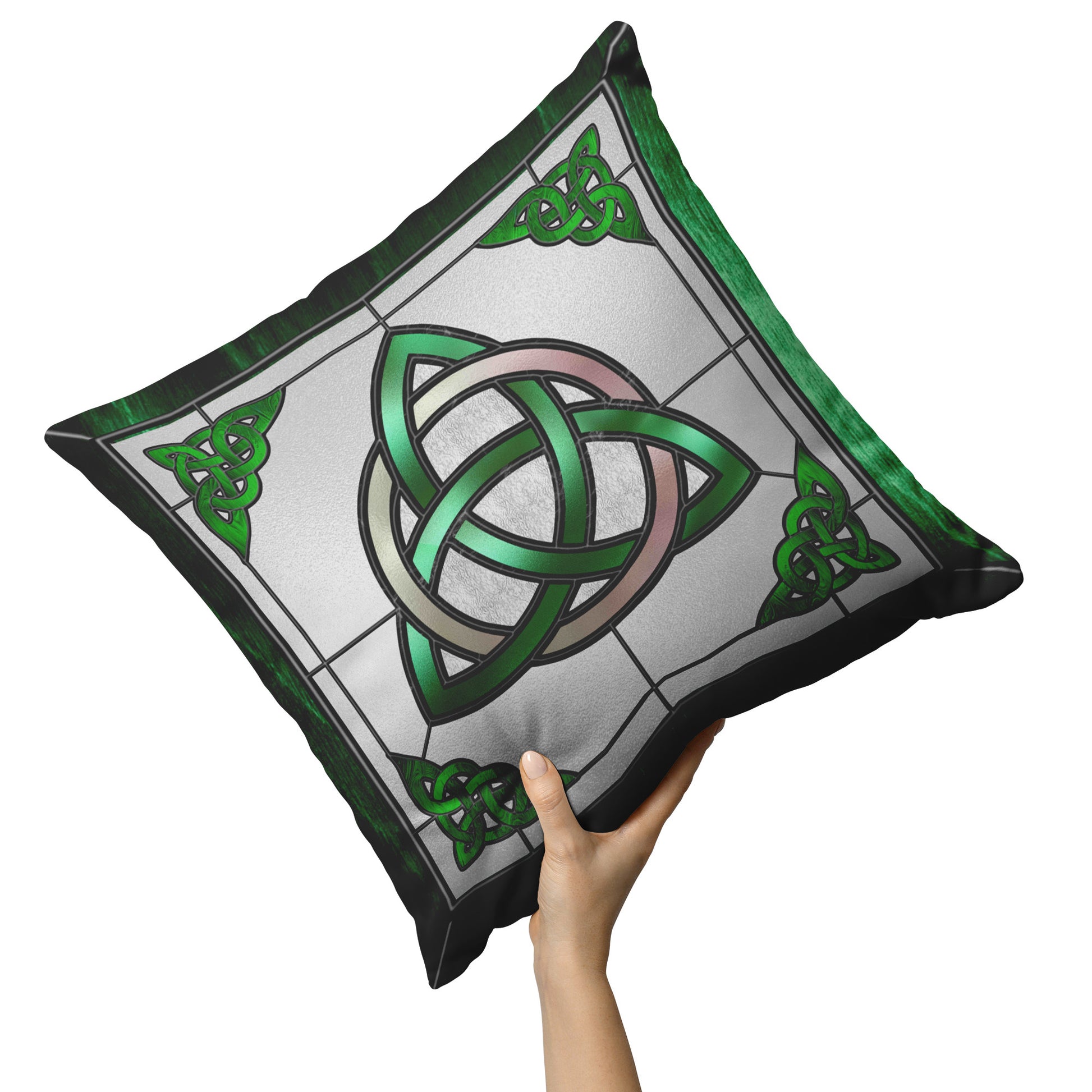 This lovely throw pillow features the Green Stained Glass Celtic Triquetra design by Ravensdaughter. These poly-broadcloth pillows are soft and durable, which means they are a fully functional pieces of art that are meant to be used.