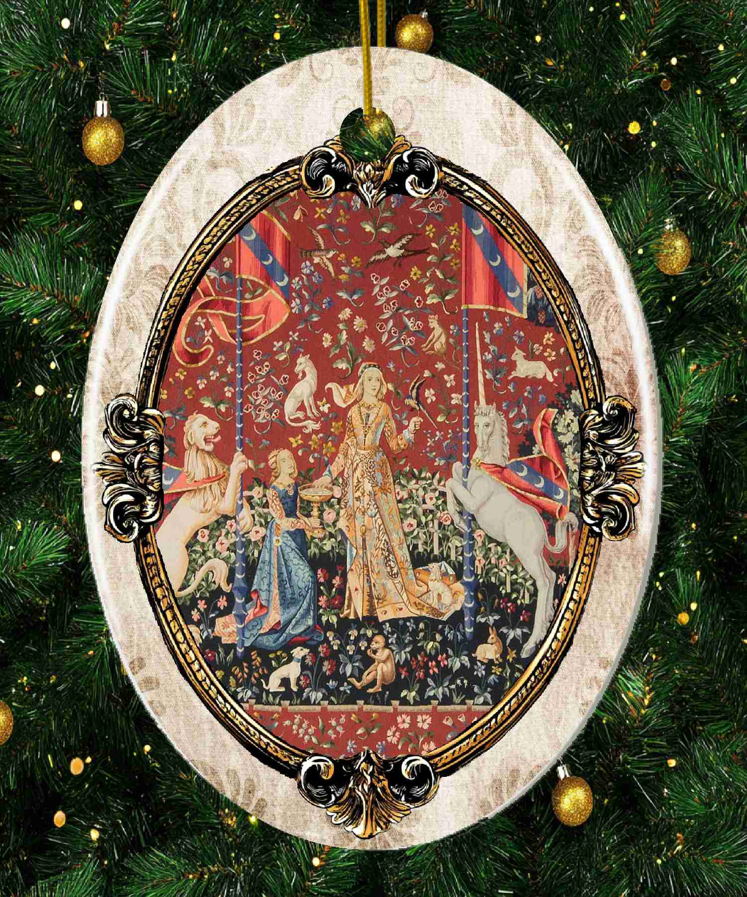 Now you can display these wondorous works of medieval art in these lovely holiday ornaments. Made from lightweight ceramic, each ornament measures 3.25" long and comes with a gold cord.