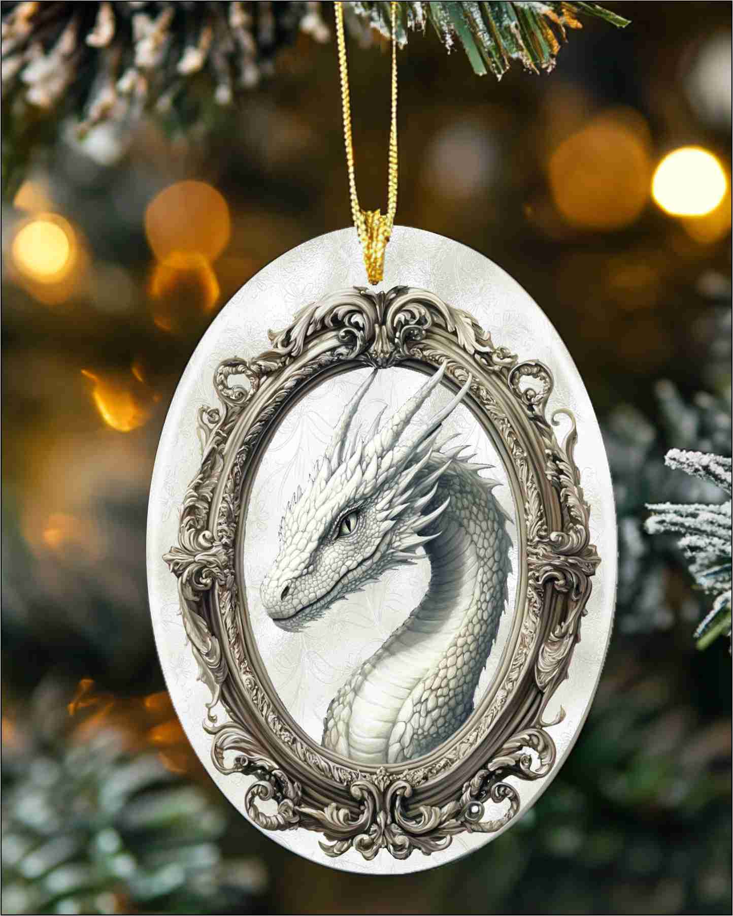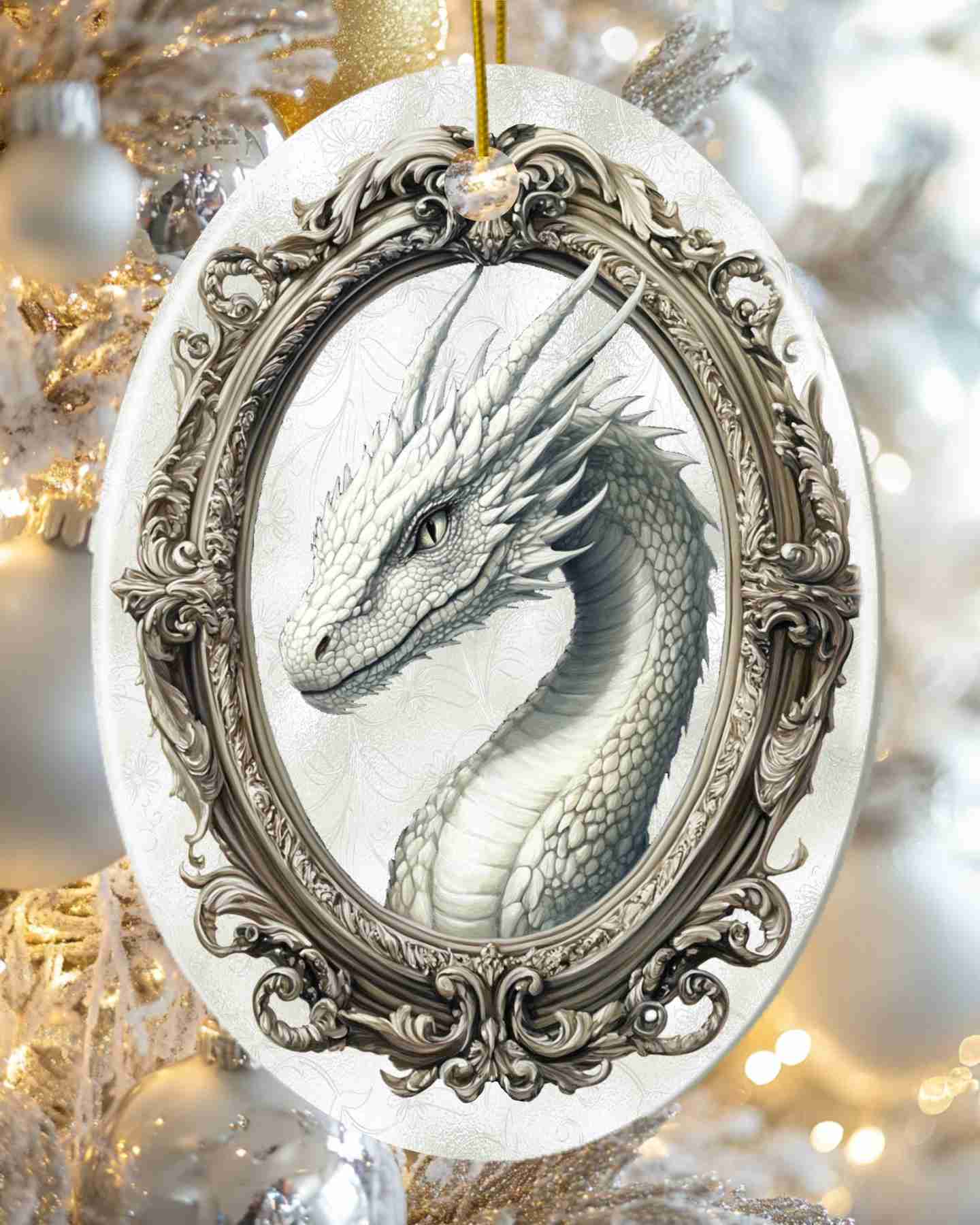 This ceramic hanging ornament features the White Dragon digital collage by Ravensdaughter. Lightweight with a gold cord. Hang it anywhere for a touch of fantasy flair!