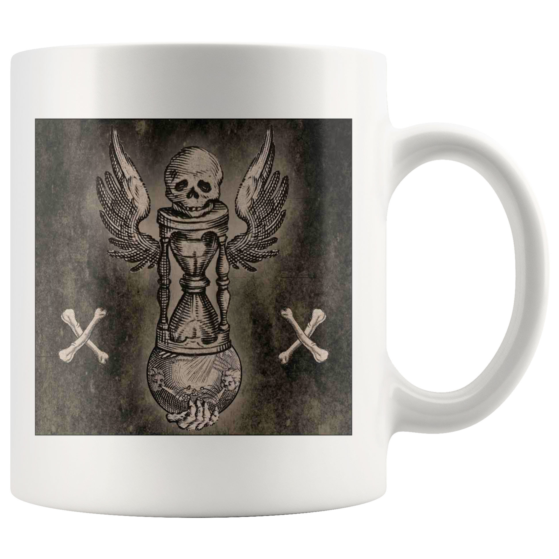 This coffee mug features a Winged Hourglass design made from elements of the17th century The Mirrour Which Flatters Not woodcut The digital collage is by Ravensdaughter.